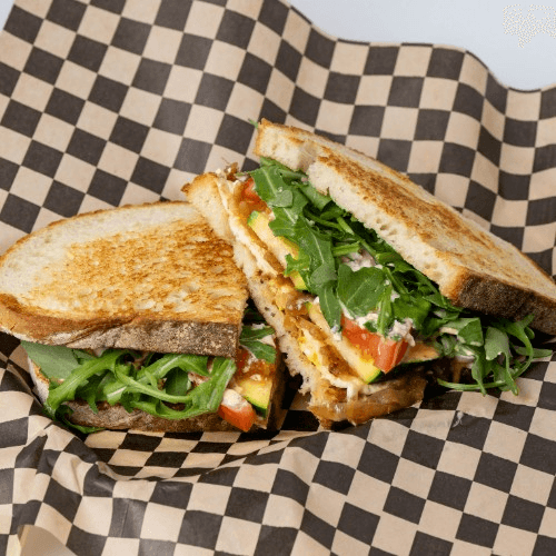 caramelized onions, zucchini, egg, cheddar, avocado, tomato, house sauce, and arugula