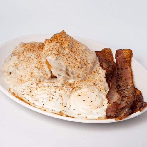 Biscuit, gravy, one over easy egg, bacon, paprika
