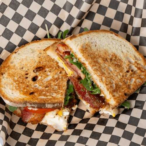 Protein ,egg, provolone, bacon, sun-dried tomato pesto, mayo, and arugula