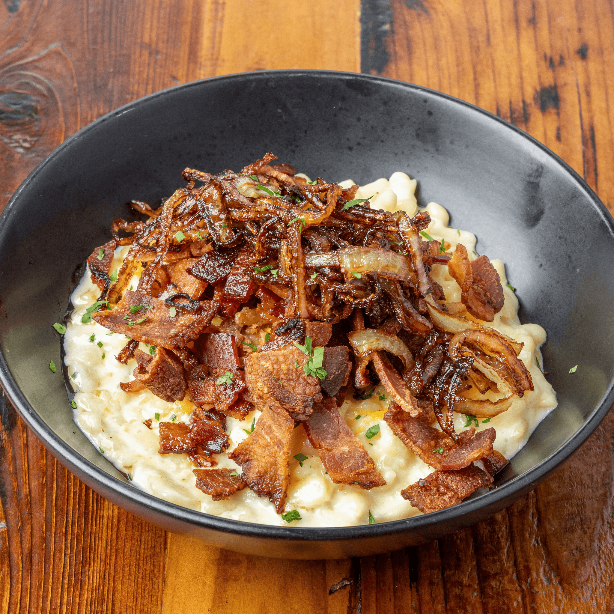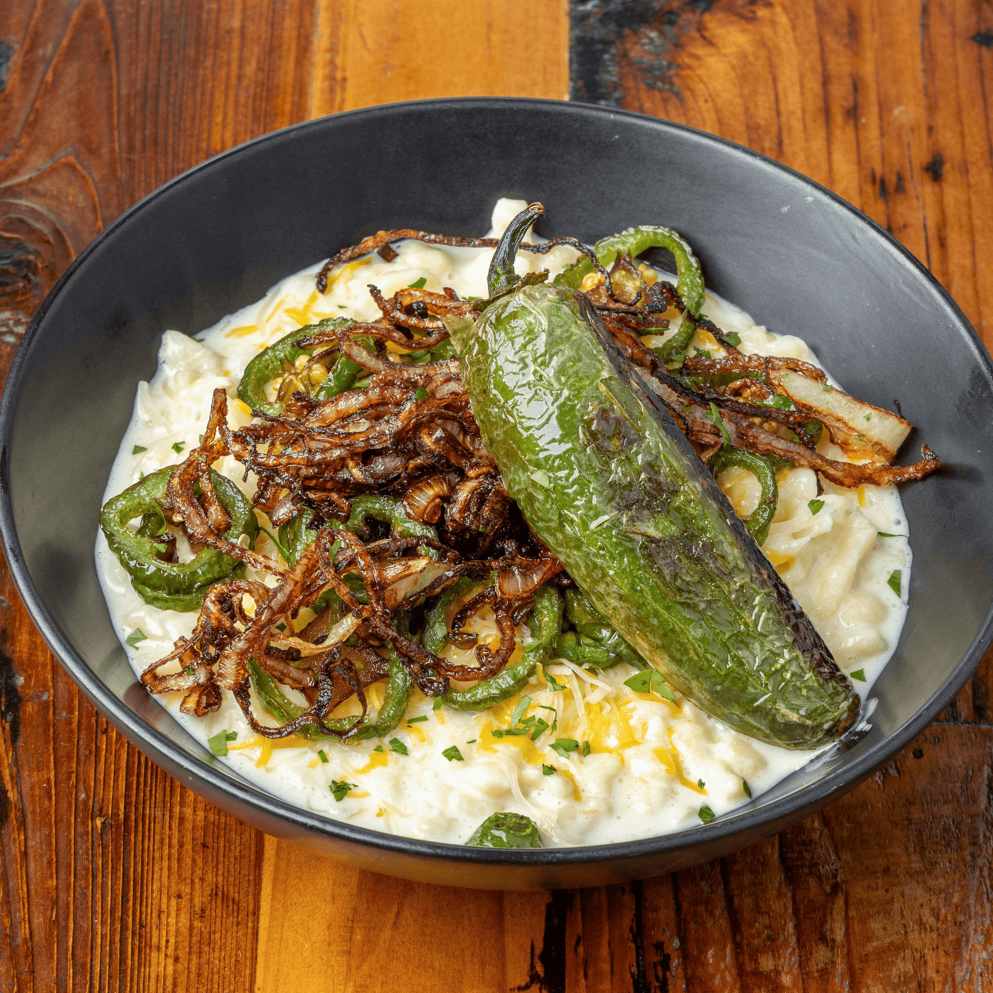 German egg noodles served with a rich, creamy cheese sauce, jalapenos, and topped with fried onions