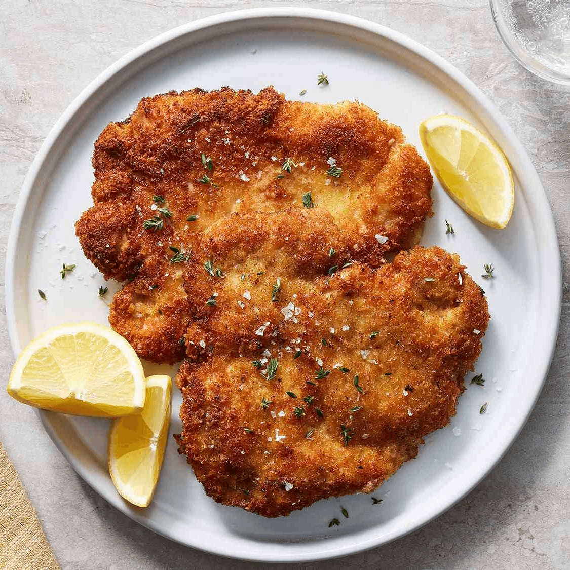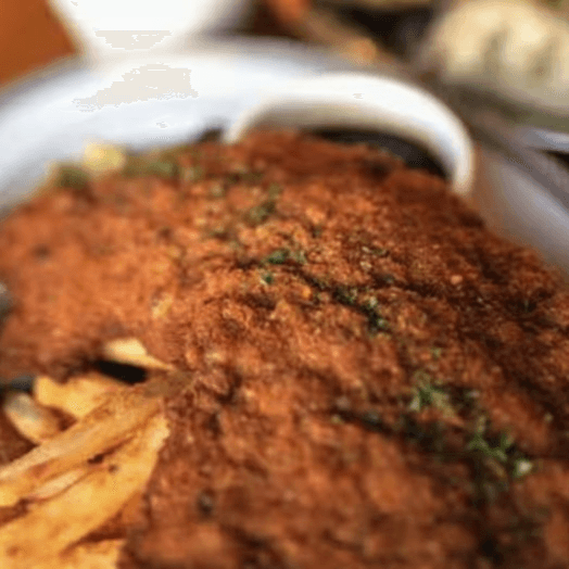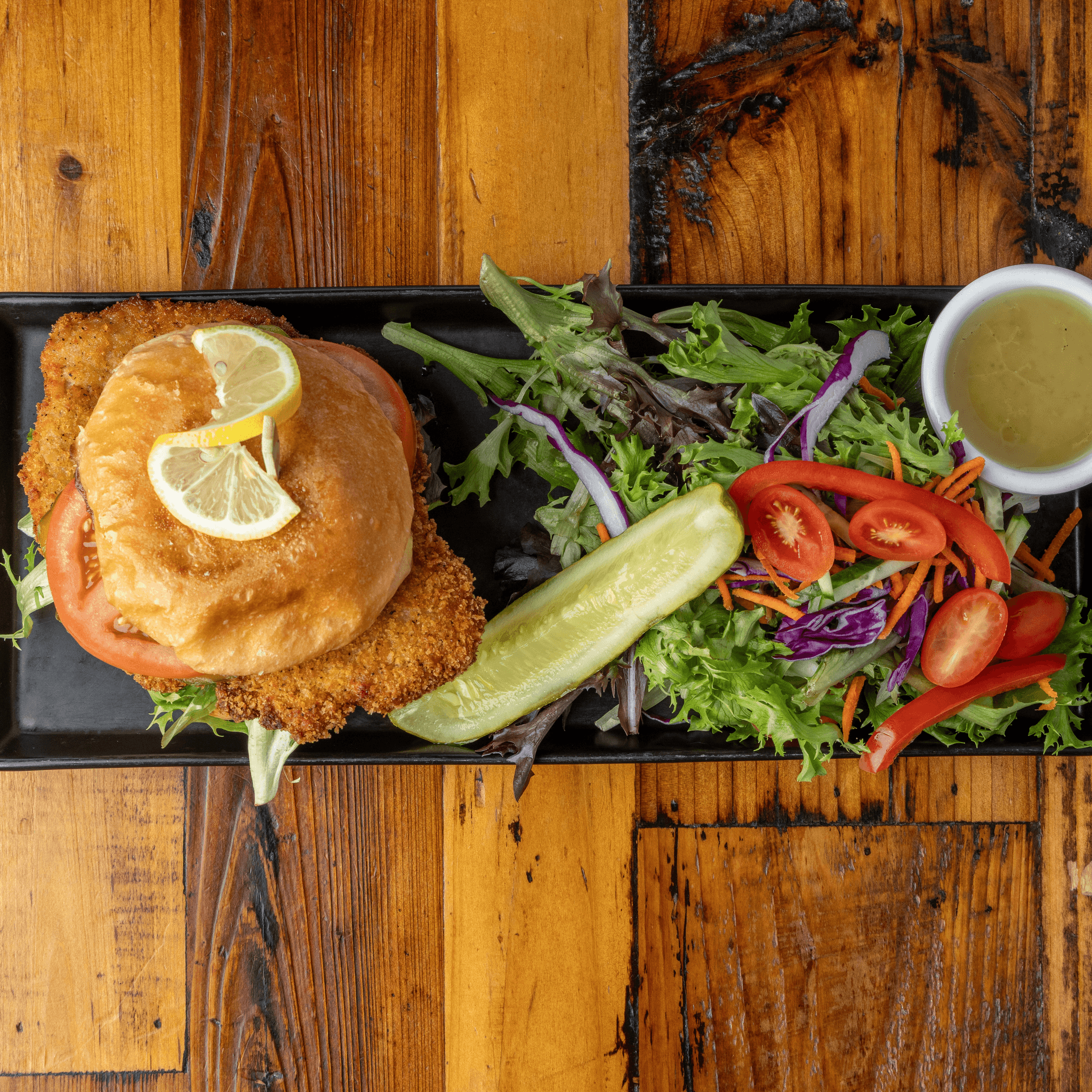 Breaded pork or chicken schnitzel, lettuce, tomato, and pickles on a brioche bun