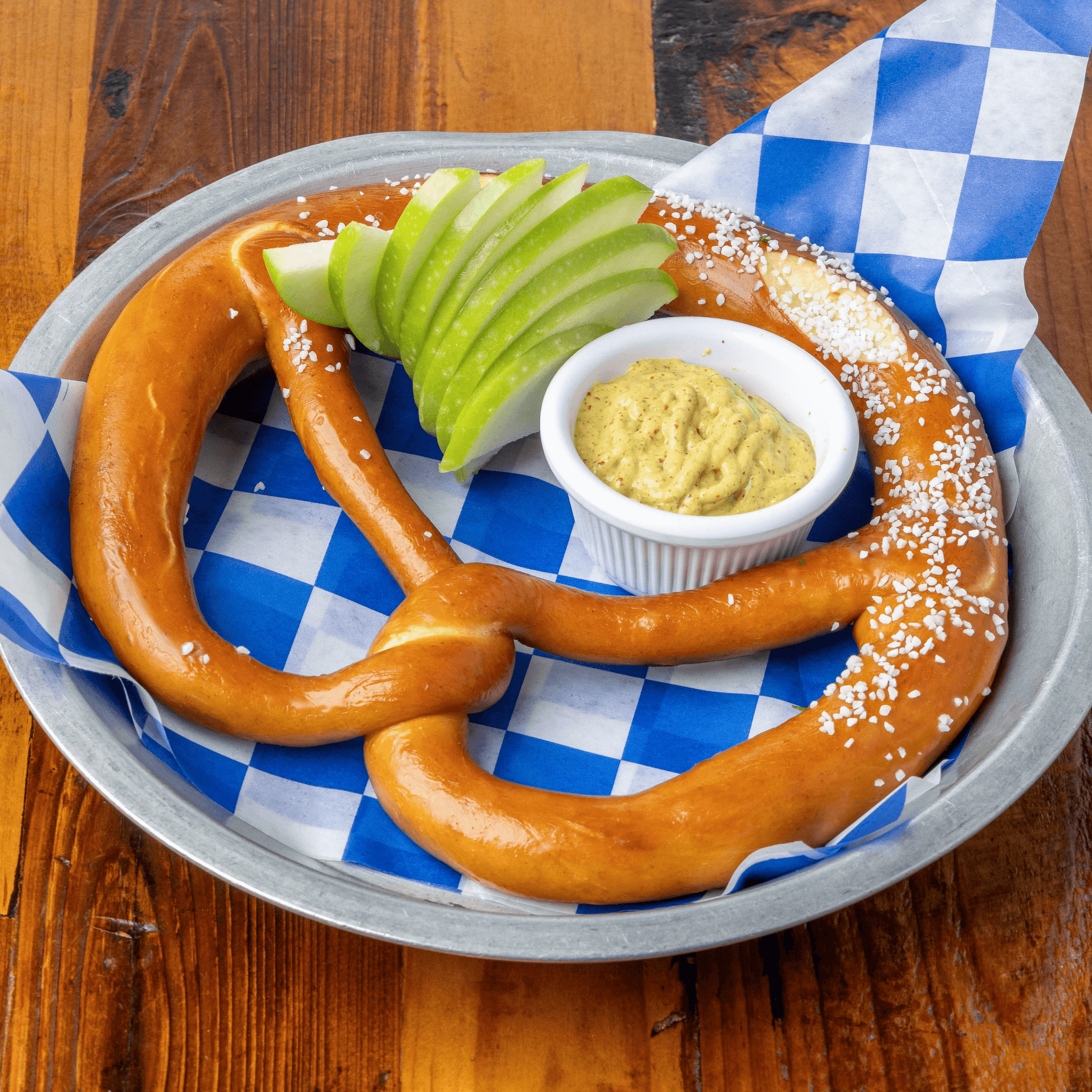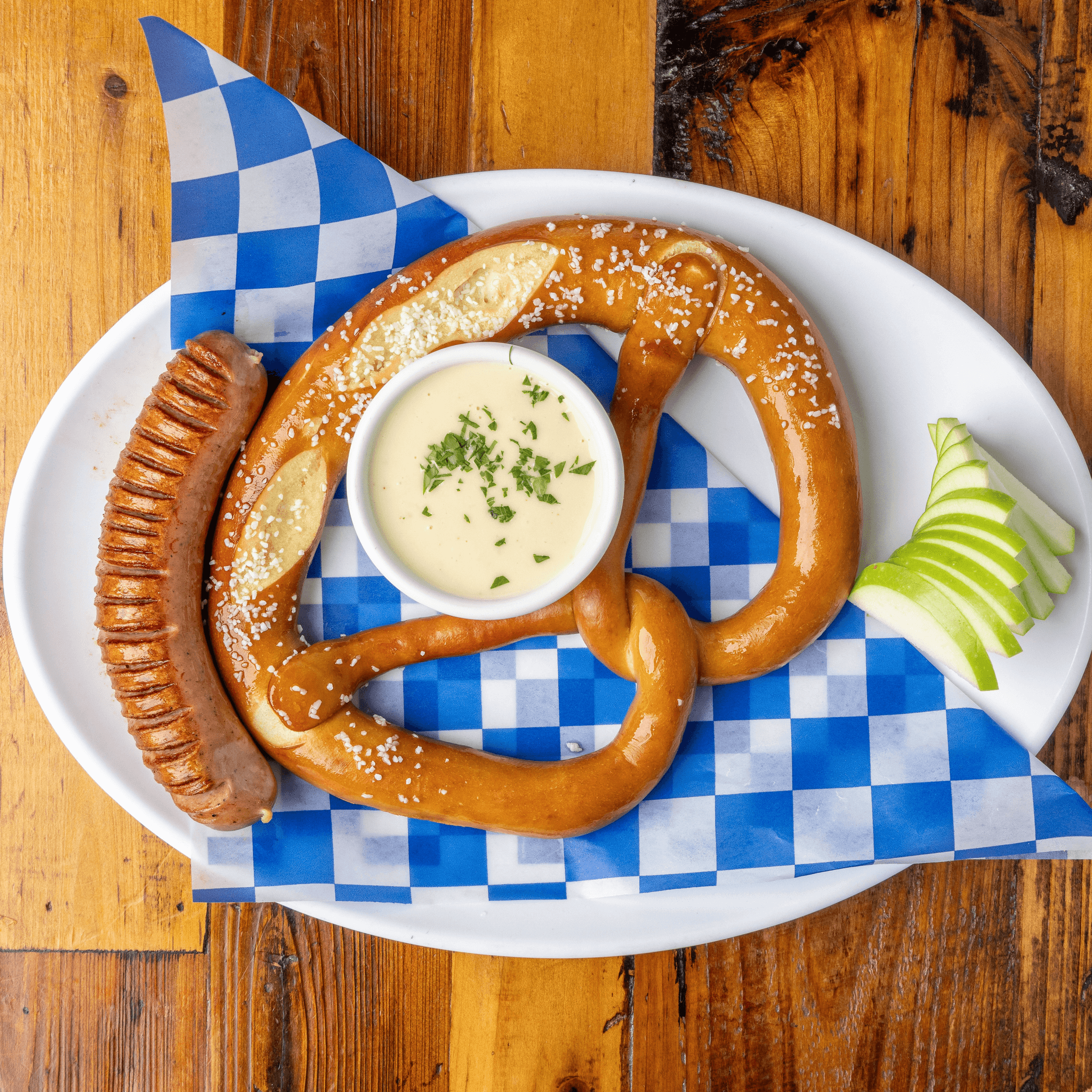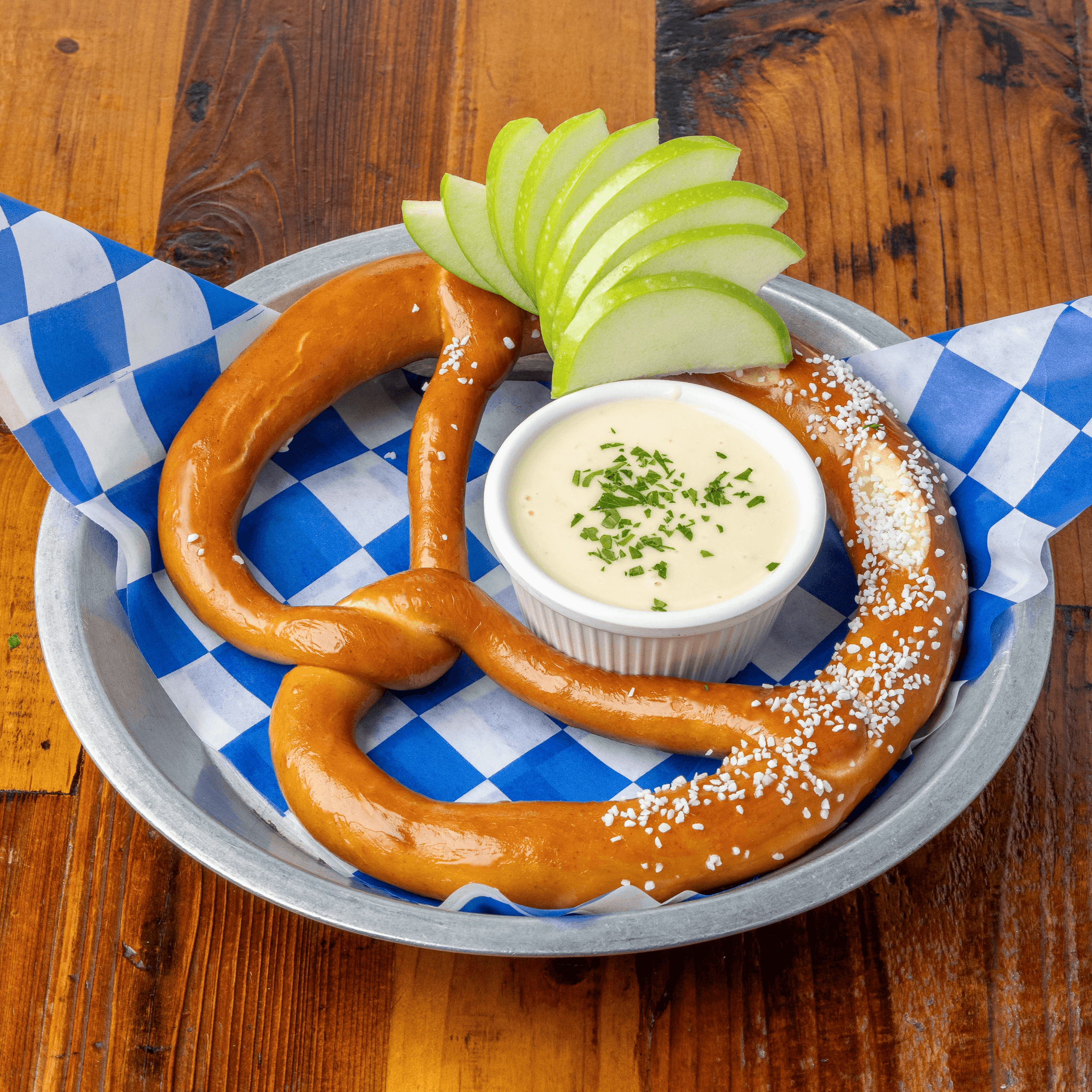 Bavarian pretzel with Swiss fondue and apples