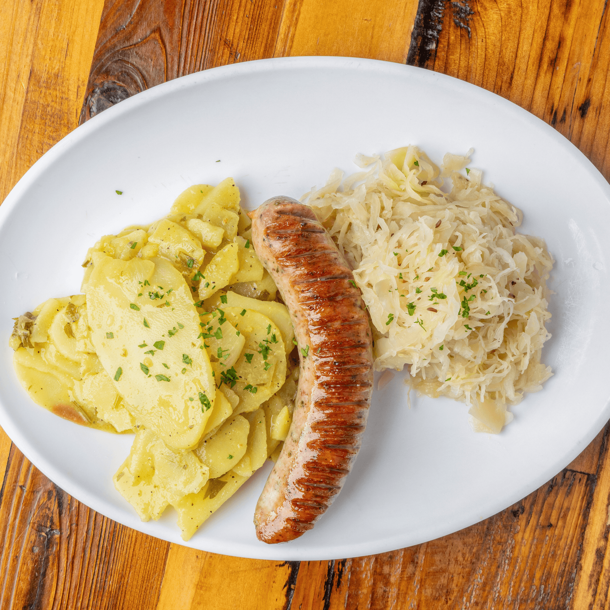 1 wurst. Wurstplatte authentic craft-made German-style sausages. Served with sauerkraut & Pommes frites or German potato salad