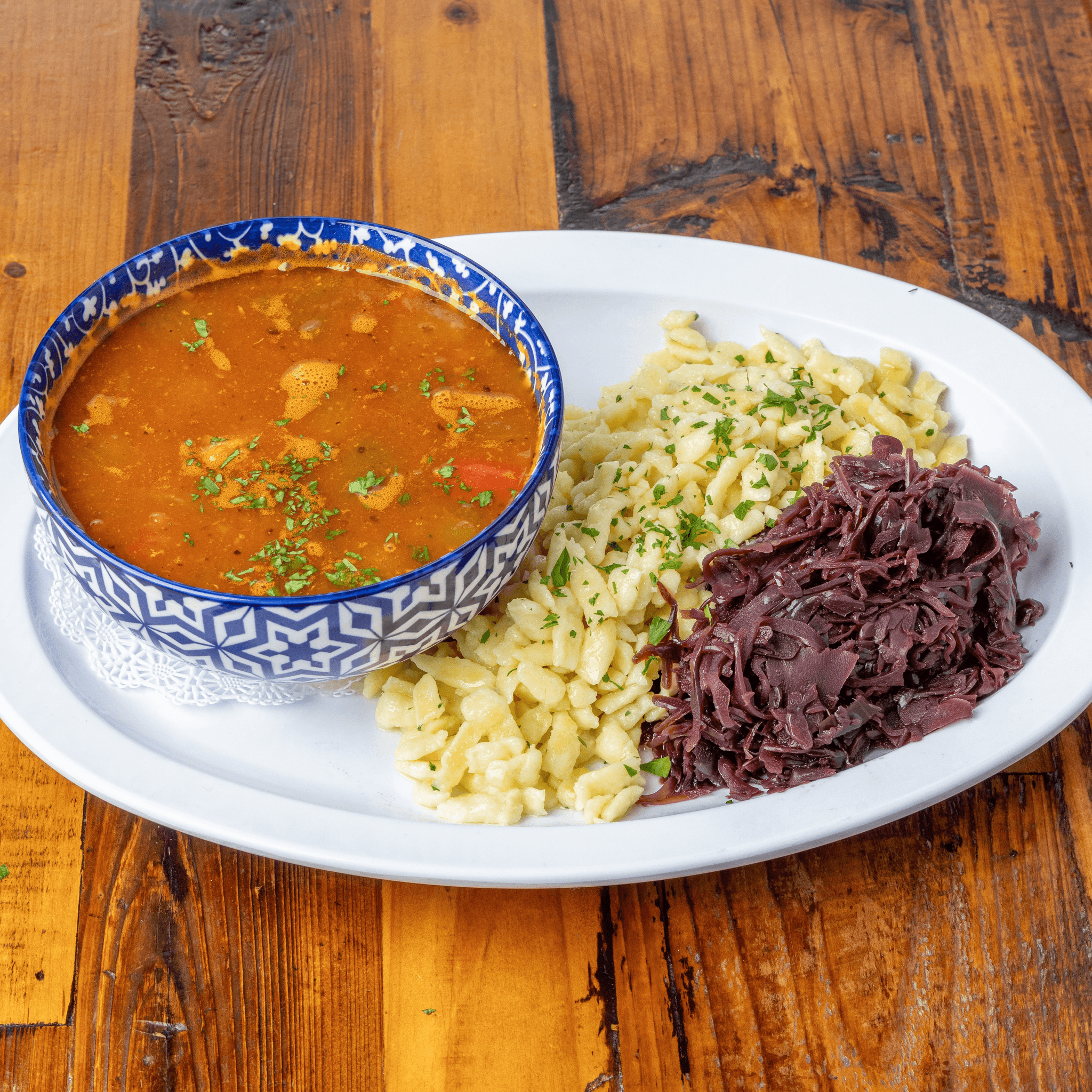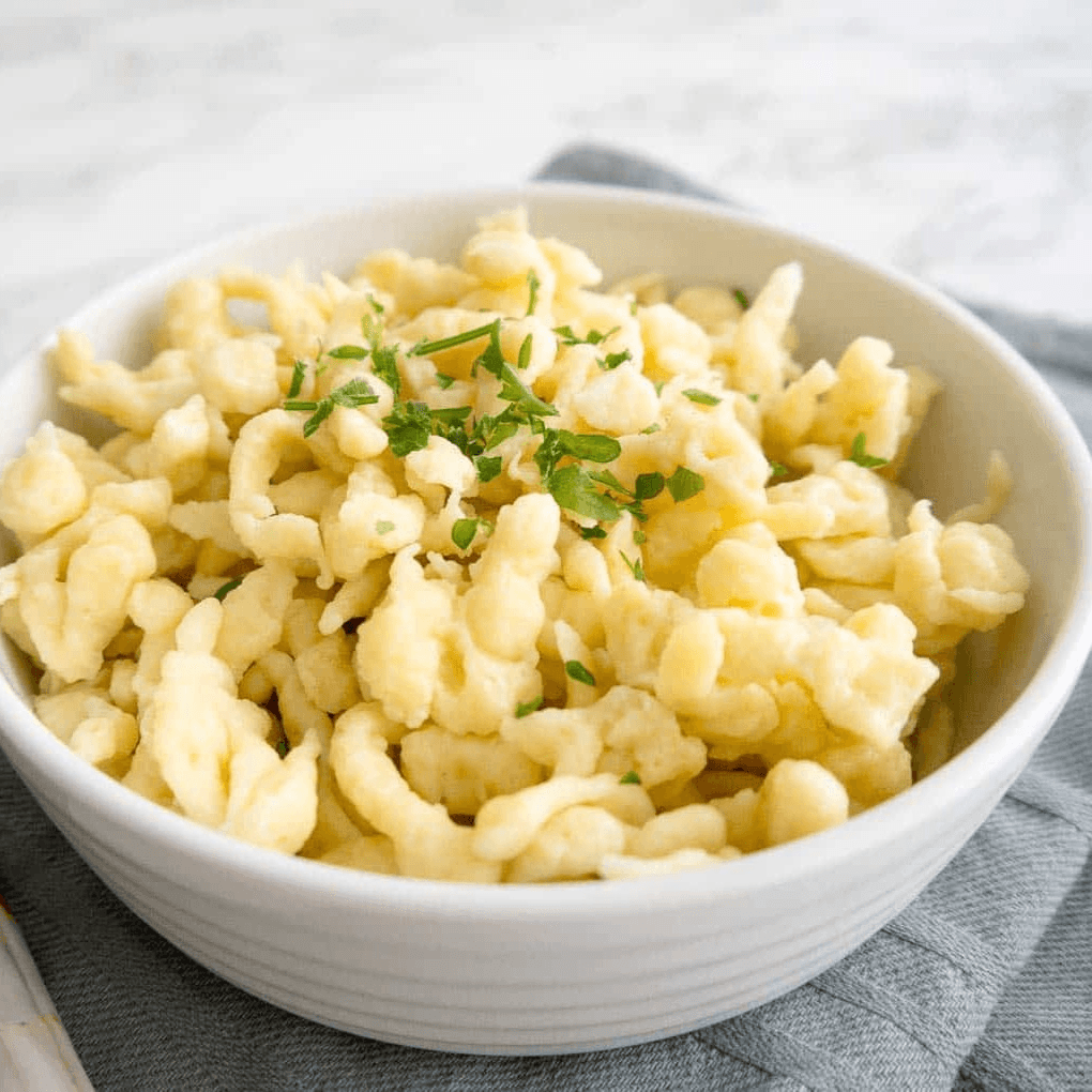German egg noodles served with a rich, creamy cheese sauce and topped with fried onions