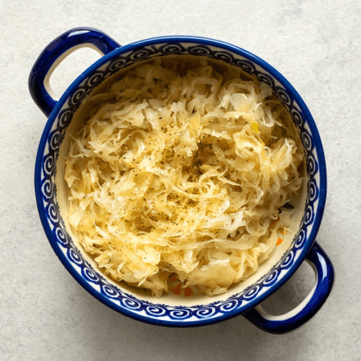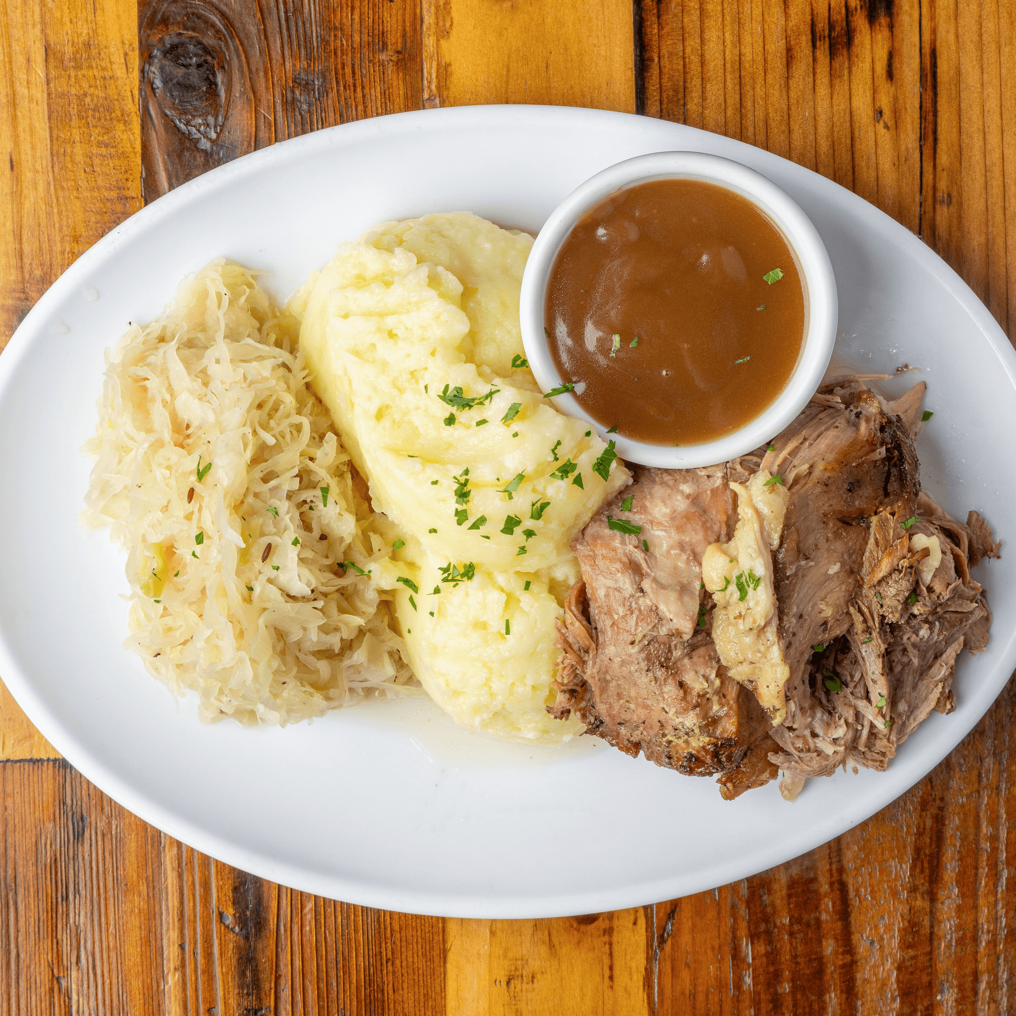 Slow-roasted pork with mashed potatoes and sauerkraut