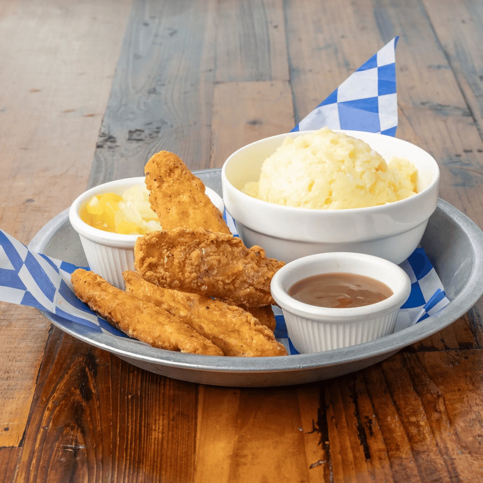 Chicken strips served with mashed potatoes and fruit