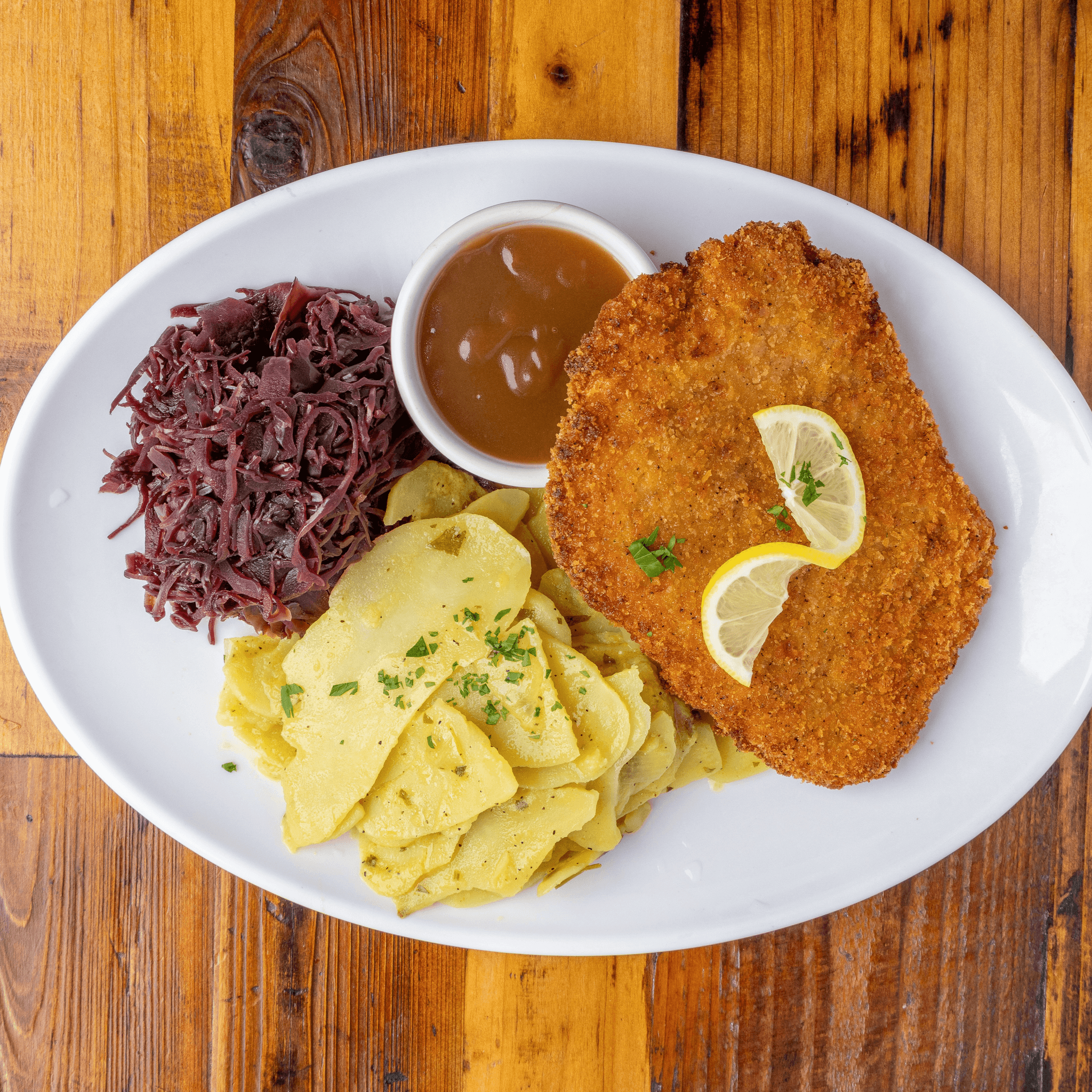 Breaded pork schnitzel served with warm German potato salad, red cabbage, and gravy