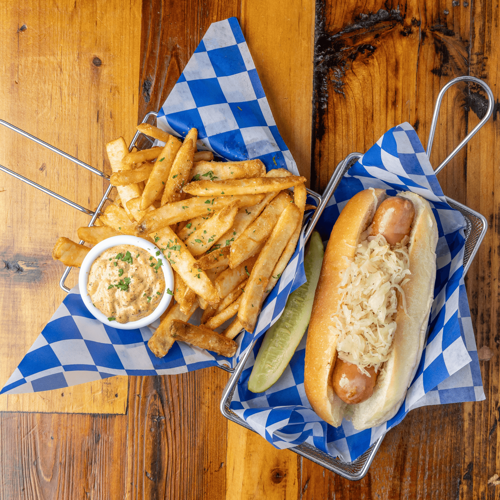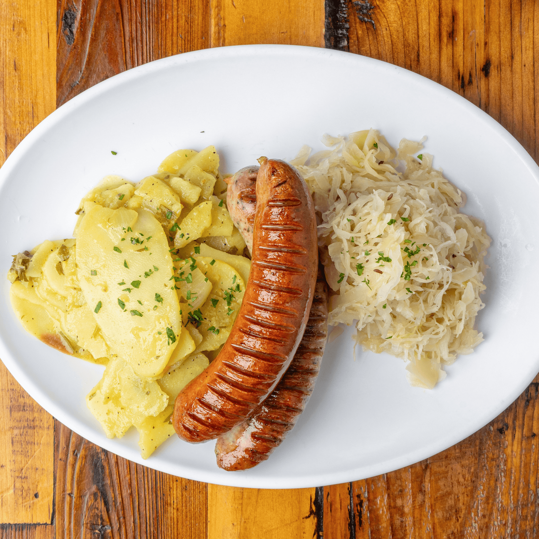 2 wurst. Wurstplatte authentic craft-made German-style sausages. Served with sauerkraut & Pommes frites or German potato salad