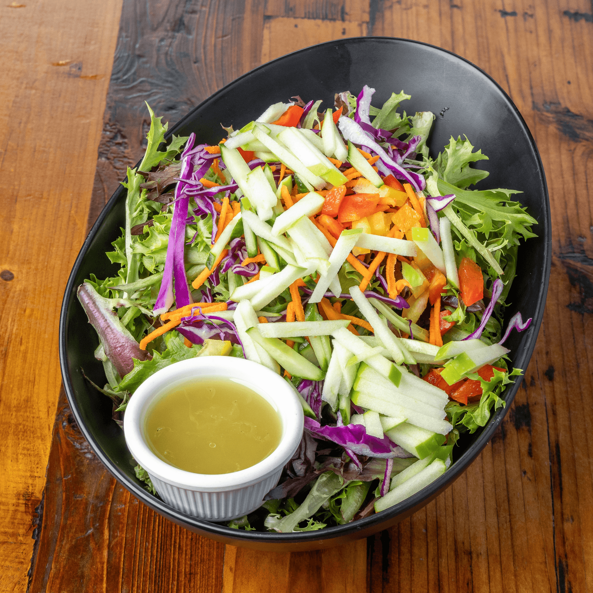 Locally sourced salad mix with apples, tomatoes, cucumber, carrots, and light vinaigrette dressing