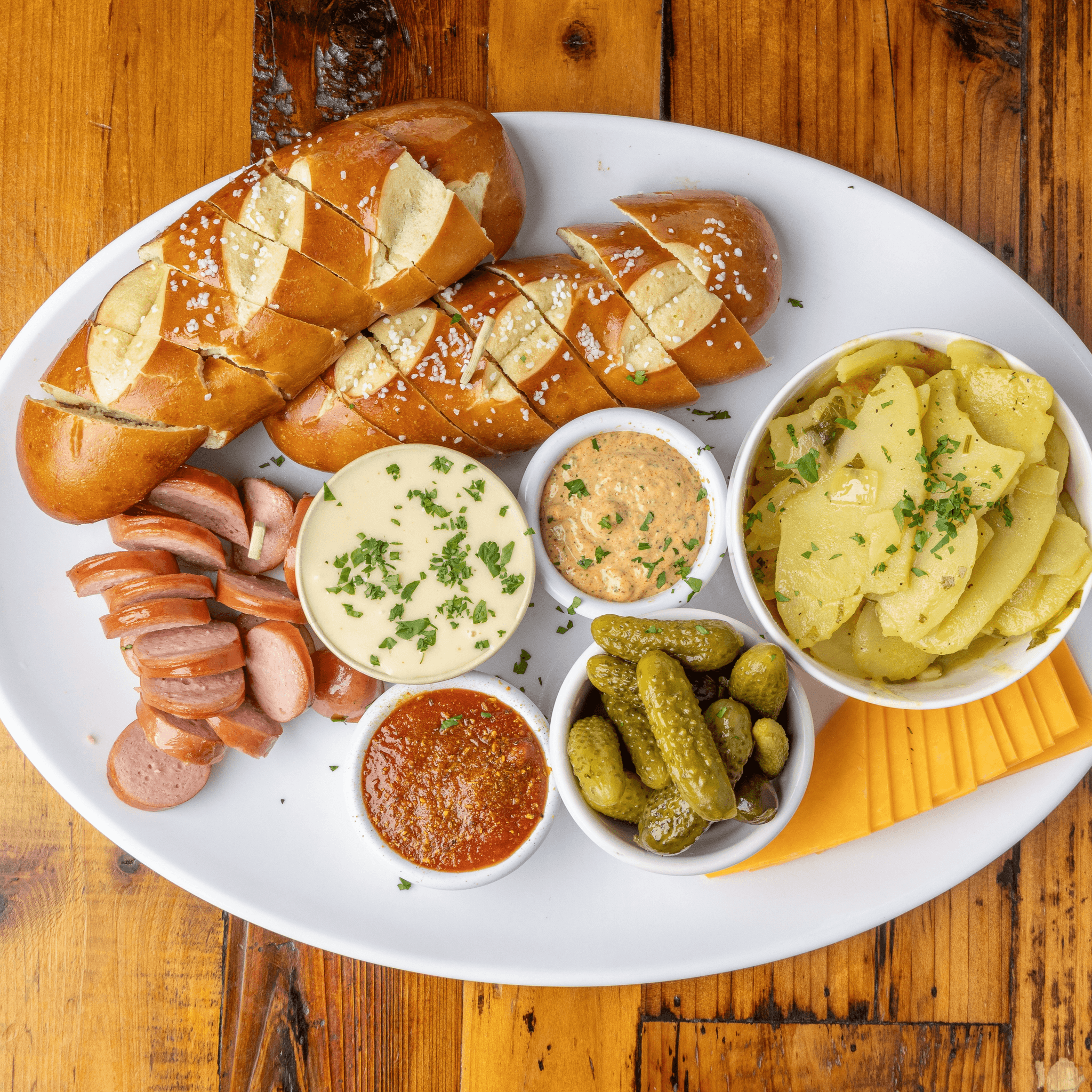 A small sample plate featuring sliced bratwurst, cubed seasonal cheese, sliced pretzel bun, assorted pickles, potato salad, remoulade, curry ketchup, and Swiss cheese fondue