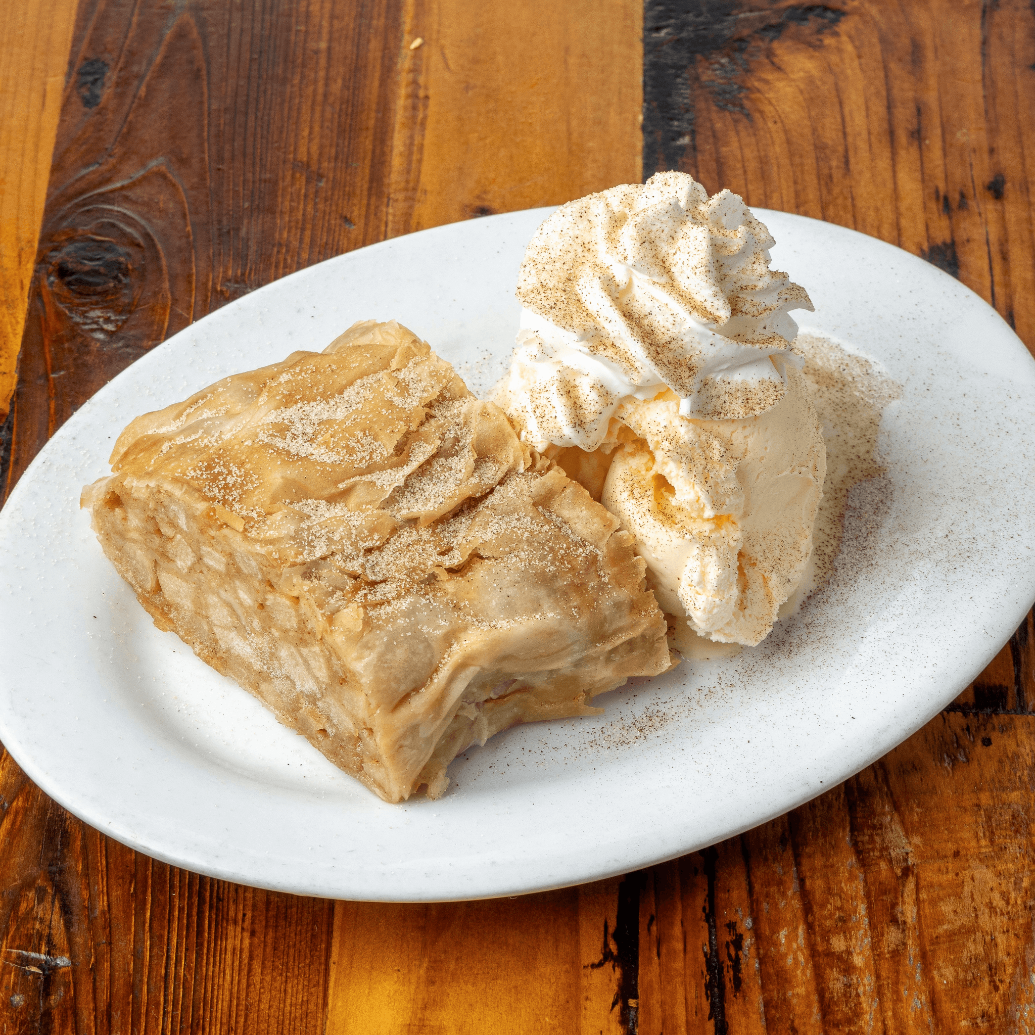 Served warm with whipped cream & vanilla ice cream