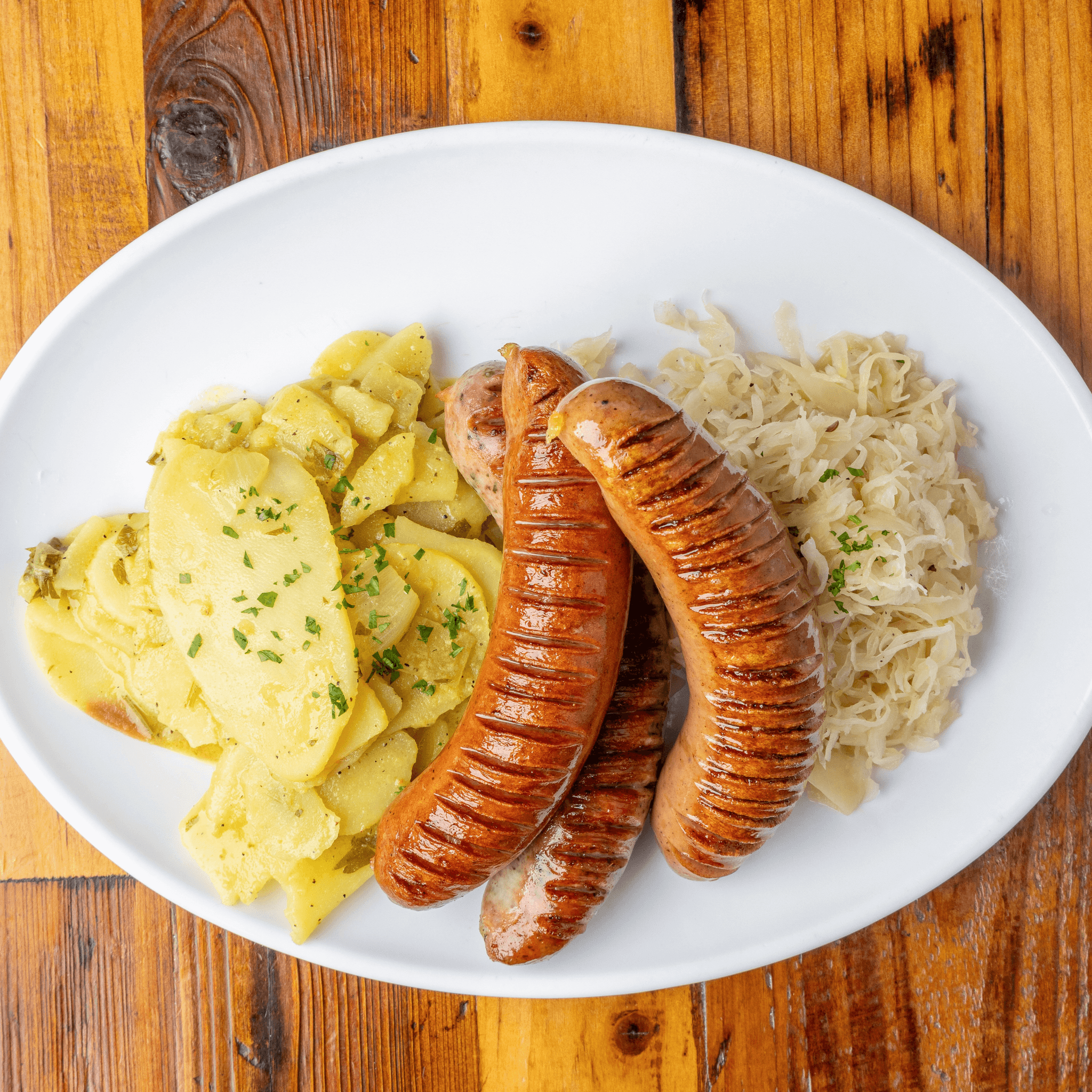 3 wurst. Wurstplatte authentic craft-made German-style sausages. Served with sauerkraut & Pommes frites or German potato salad