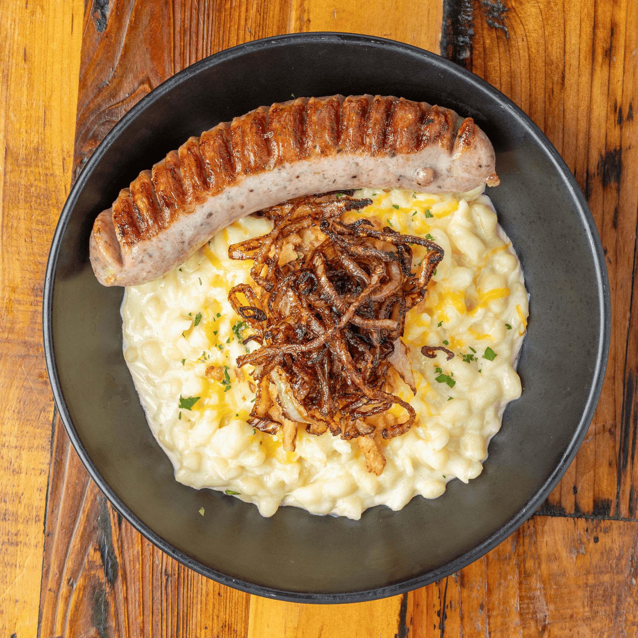 German egg noodles, cheese sauce, fried onions, and your choice of one sausage