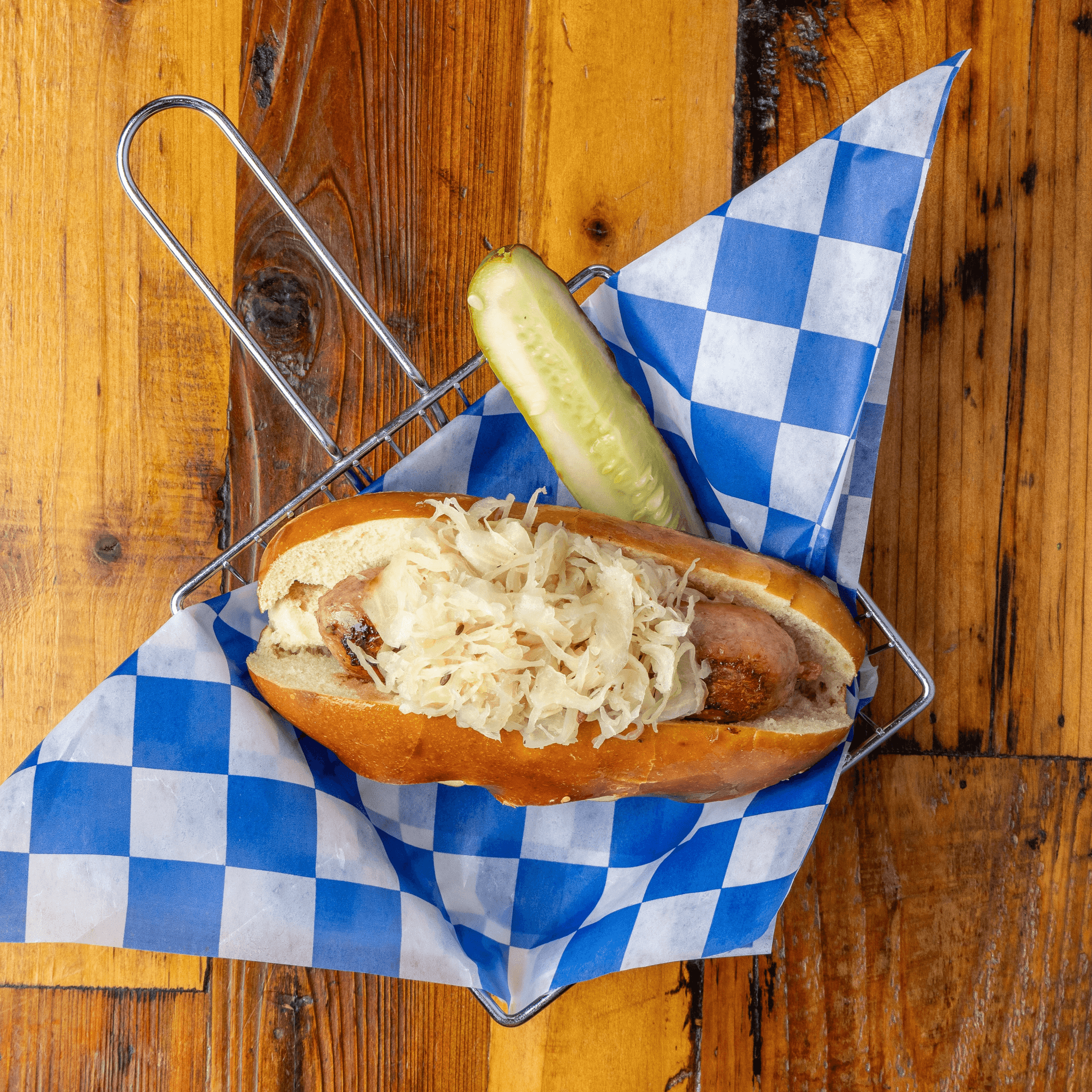 Choice of wurst served on a bun with sauerkraut and German mustard