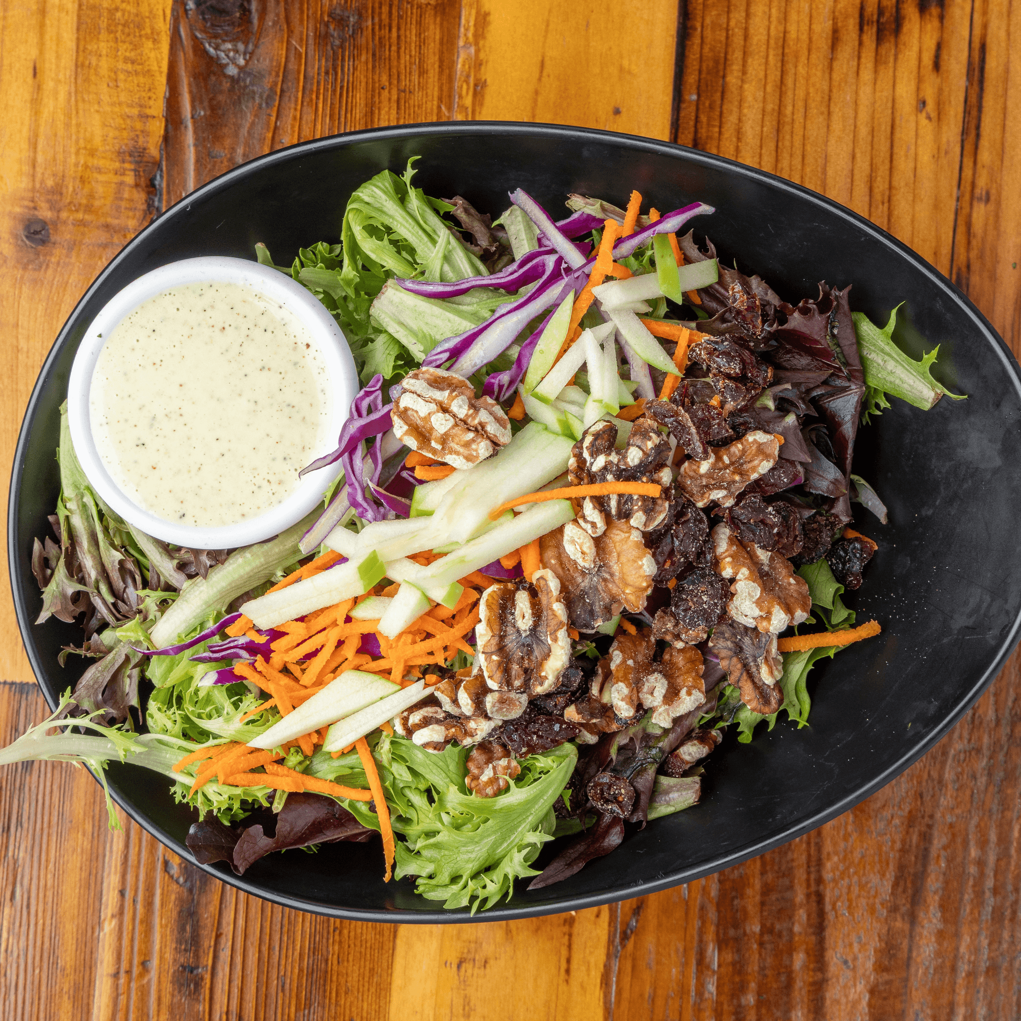 Farmer's salad mix with cranberries & carrots, red cabbage, apples, and walnuts, served with house-made Swiss dressing