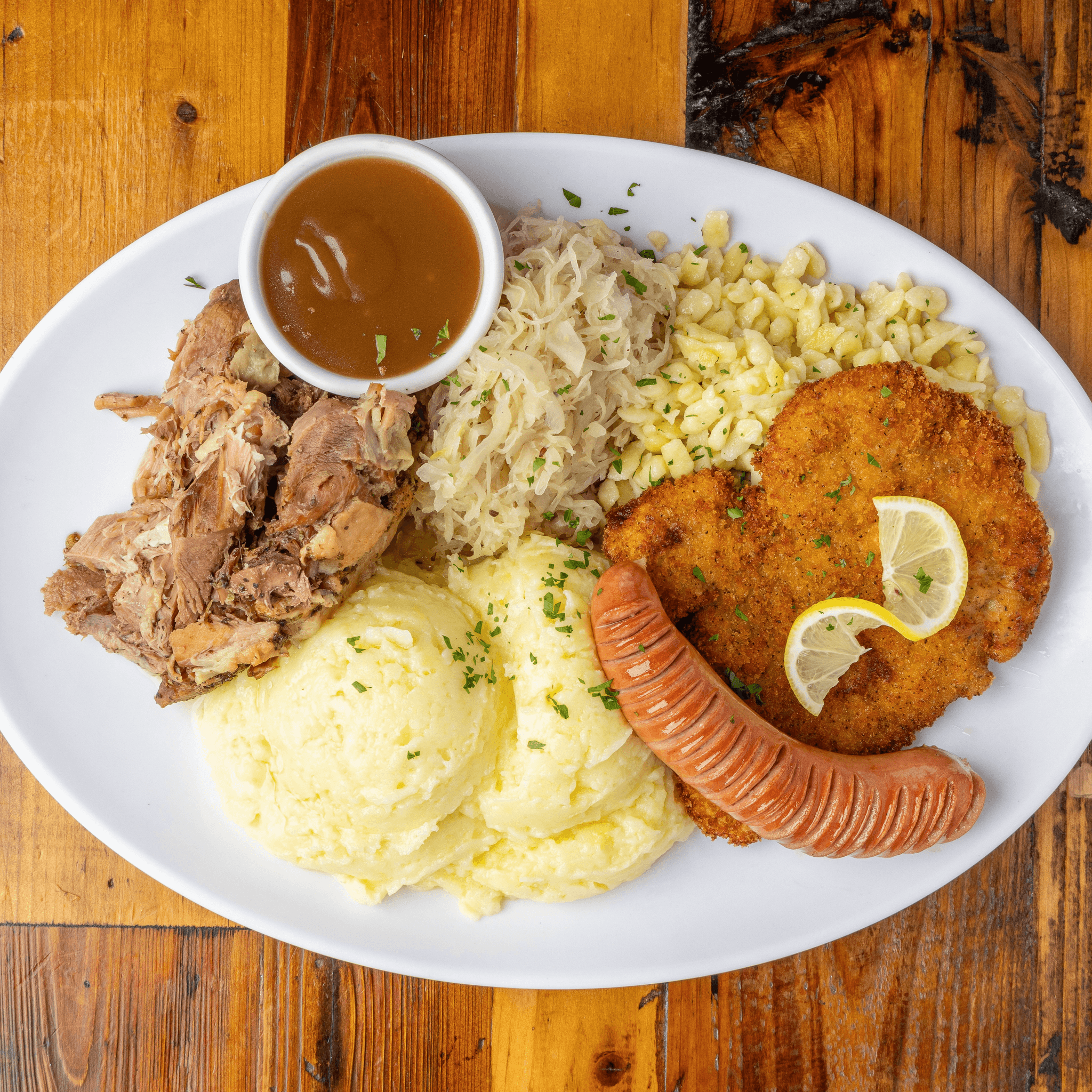 Big sample plate with schweinebraten, pork schnitzel, bratwurst, mashed potatoes, spaetzle, gravy, and sauerkraut
